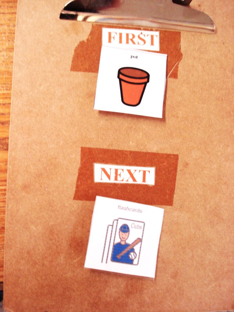 たくさんの予定を一度に提示してしまうと混乱してしまう人など、その当事者の特性に合わせてこのようなスケジュールを使用することもあるようです。このスケジュールでは、「今やっていること」と「次にやること」のみの提示になっています。
