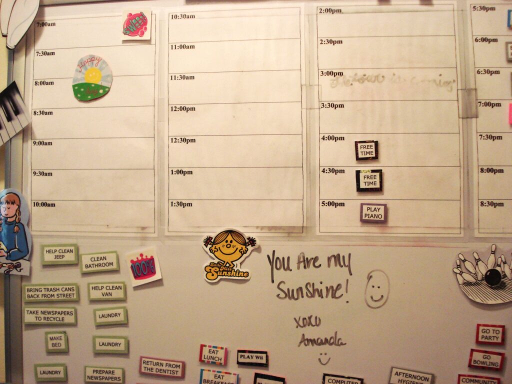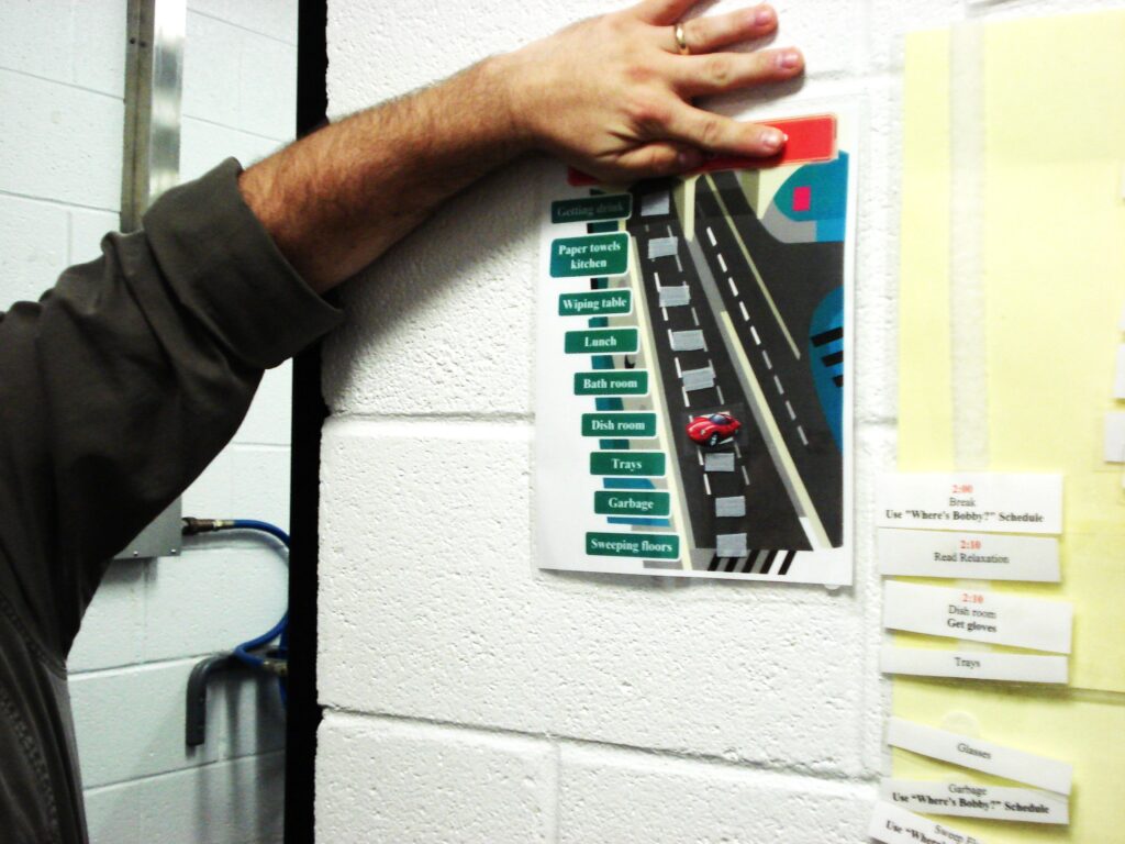 ASDの方は、見通しを持てない環境では強い不安を感じます。そのために「スケジュール」と言う見通しを持つためのオーダーメイドされたツールをそれぞれの方が使っています。この方は文字を読むことが出来るので、文字で書かれた活動を毎朝ご自分でボードに貼って完成させるそうです。