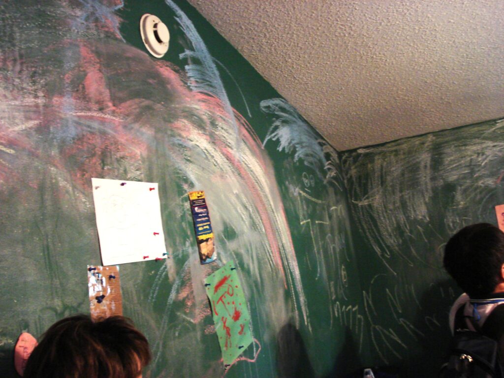 強度の行動障害のある方専用のグループホームのひと部屋です。この方は、どこもかしこも落書きをしていた方だそうですが、自室の中に限っては思う存分書いて良いことにし、他のところでは落書きをしないように教えたそうです。その為に部屋の壁一面を黒板にして、後で消すことが出来るようになっています。