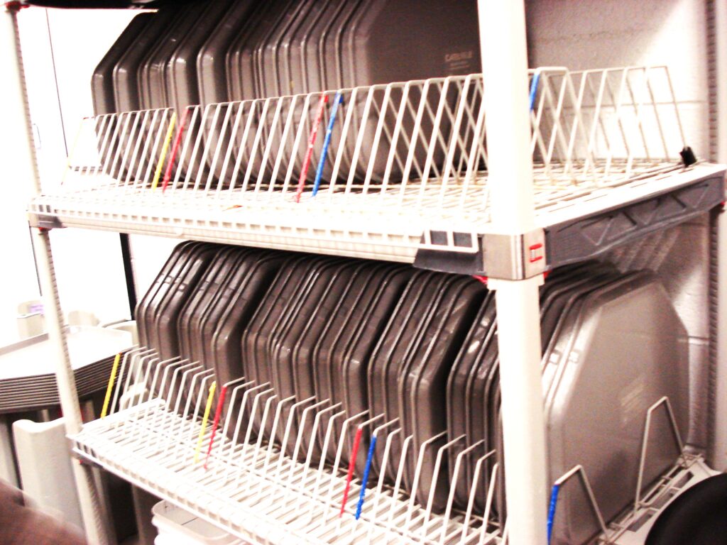 レストランのキッチンでおぼんを片付ける方用の視覚的指示で、それぞれの色で区切られた部分を一回に運ぶような指示になっています。これをする前、「どれだけの枚数を一度に運んだら良いのか分からず、すべてを一度に運ぼうとする」などが見られたために、このように1回分を色分けしたそうです。