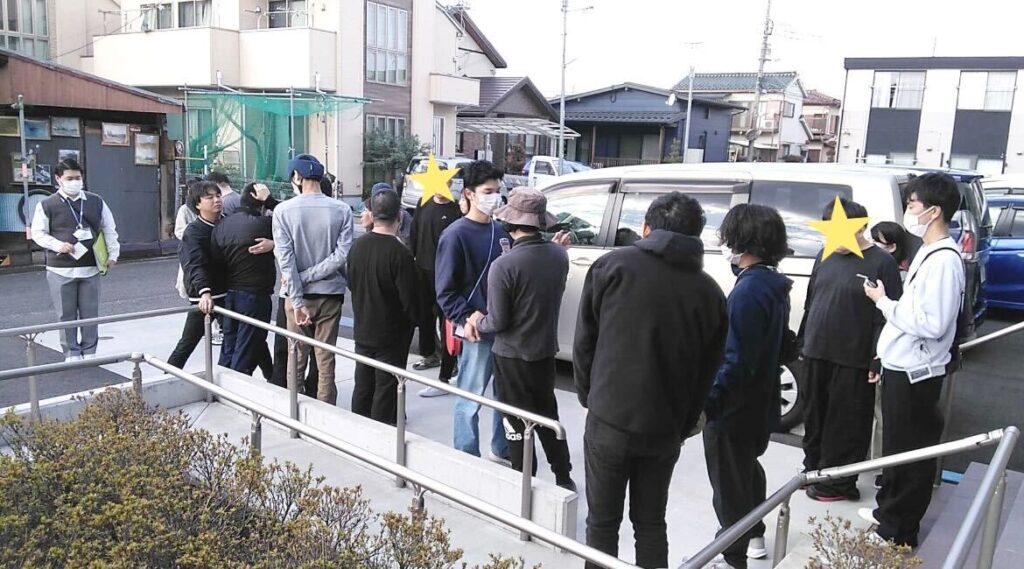 前回5月の参加人数は3名でしたが、今回は利用者様9名+体験利用者1名の計10名。職員数も増えているため、改めて「どうすれば安全に、落ち着いて避難できるか」を検討しました。