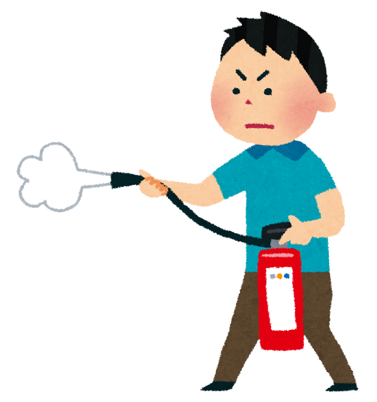 職員がすぐに火元へ向かい、消火器で初期消火を試みます。